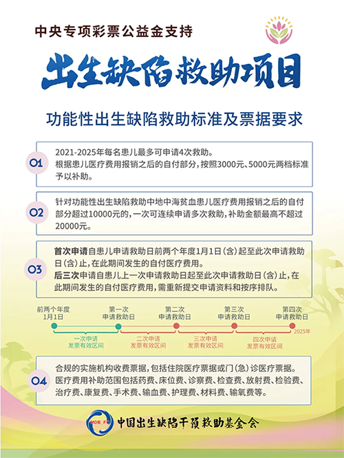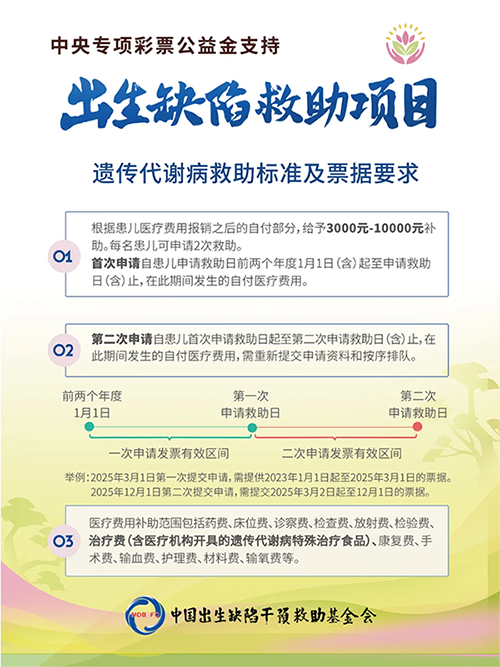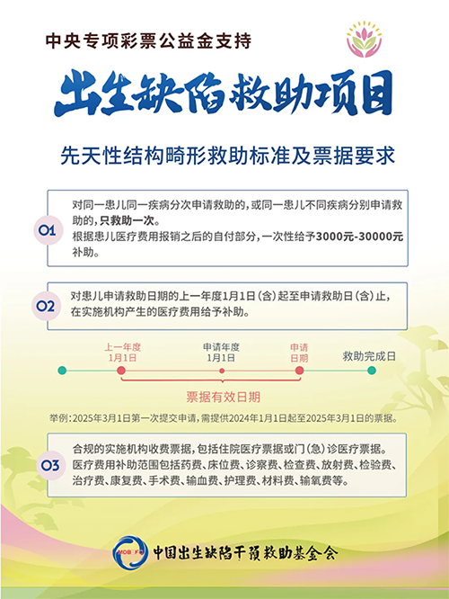 为进一步加强出生缺陷综合防治,2025年我会继续在全国范围实施中央专项彩票公益金支持出生缺陷干预救助项目。项目为患有遗传代谢病、先天性结构畸形和功能性出生缺陷三类出生缺陷疾病的经济困难家庭患儿提供医疗费用补助,减轻患儿家庭医疗负担。申请通道已开启!