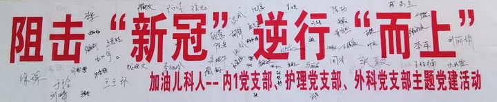 面对新型冠状病毒感染肺炎疫情加快蔓延的严重形势,我们内科第1党支部联合护理和外科支部的各位共产党员,吹响冲锋号,开展“阻击‘新冠’不畏险,逆行‘而上’风雨中”的主题党建活动。活动倡议全体支部党员,发挥旗帜带头作用,在党和人民需要的时候,挺身而出,勇往直前。哪里需要、哪里有困难,哪里就是党员同志的战场。无条件服从医院的整体安排,只要一声令下,到最需要的地方去,随时听候派遣。把初心写在行动上,把使命落在岗位上!主题活动时,外科党支部的王达辉书记还带领大家宣誓:“在疫情防控面前彰显新时期共产党员的模范作用!为守护儿童健康贡献力量!”。支部党员们都在“阻击新冠,逆行而上”的横幅上郑重地签下了自己名字,以表自己无悔初心,无悔使命,誓与“新冠”病毒疫情奋战到底的决心!