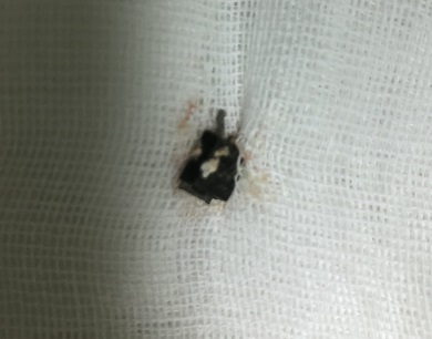 手术的确像预想的一样艰难,灿灿的气道壁比较软,分泌物也偏多,再加上异物的金属部分位于内侧,气管内镜下很难看清异物全貌,稍不注意就有损伤气道壁的可能,操作必须慎之又慎。历经半个多小时的精细操作,异物终于被安全、完整地取出来了,原来是一个已经生锈的二极管。难以言表的喜悦和幸福,全藏在那深深的防护罩之后,“如果异物再多放一段时间,对灿灿的危害将会有多大。”陈超医生感叹道。
