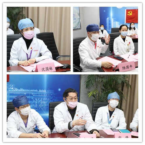 随后,李智平主任汇报沪鄂同心抗疫守望相助党支部共建倡议书,此次共建紧密围绕抗疫诊疗工作,发挥共建单位各自专业优势,拟在以下几个方面展开共建工作:一是进一步建立完善新冠肺炎儿科应急药品供应机制,全面保障疫情期间药品供应;二是多学科拟定优化儿科新冠临床用药处方目录引领指导全国乃至疫情蔓延态势的全球,全力守护新冠患儿药物治疗安全有效;三是提供儿童新冠防疫用药咨询服务,线上线下为患儿及家属答疑解惑提供专业服务;四是提供门急诊患儿及家长对呼吸道疾病预防的健康教育、健康咨询、线上问诊等服务;五是联合推送系列儿童新冠科学防疫科普推文,由东华大学服装与艺术设计学院视觉传达系设计原创儿童卡通绘图;联合谱写朗朗上口的科普儿歌,由共建支部填词,上海音乐学院谱曲,指导社会大众科学防治;联合推送儿童新冠科学防治专科药师专业讲座和科普视频,由上海盛视天橙传媒股份有限公司提供拍摄制作;六是联合上海音乐学院音教系推出系列项目为沪鄂二地新冠患儿及家庭和医务人员及家庭成员提供心理安抚;七是开展儿童新冠肺炎治疗基于真实世界多中心药品临床综合评价,为优化儿童新冠药物治疗提供科学佐证,并为全球疫情防控治疗提供参考资料;八是加大对医务人员家属的关爱,邀请上海音乐学院教工及学生志愿者为沪鄂二地医务人员子女作网上授乐器课程,解除医疗一线人员后顾之忧能全心扑在疫情防控救治上。