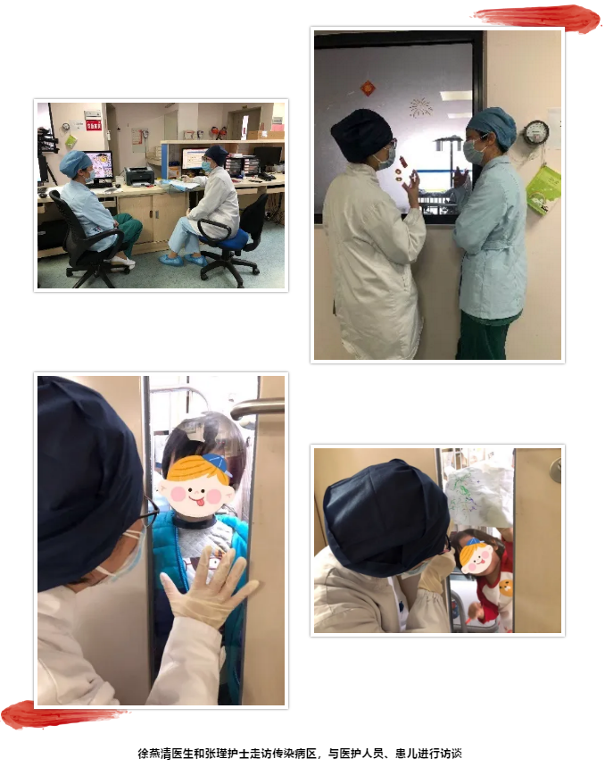 曾玫主任和夏爱梅护士长带领的医疗团队对这群心理应激高危患儿给予了全天24小时胜似妈妈的关心和照顾,心理科也迅速派出徐燕清医生和张瑾护士,进入病区,对疑似和确诊患儿进行访谈、观察和心理评估。对于年龄稍大的患儿,她们和孩子直接沟通、安抚情绪。对于低龄的孩子,他们认真观察孩子在病室的作息、和医护、病友的互动,并经常访谈医护,了解孩子的情绪、行为表现及变化。他们也一直和患儿家属保持密切联系,了解孩子在家时的日常情况,与他们在医院的情况作对比同时一一安抚、疏导。对于出院的患儿,她们不厌其烦地给出个体化心理支持方案并反复告知家长注意要点,并制定了后期的随访计划。