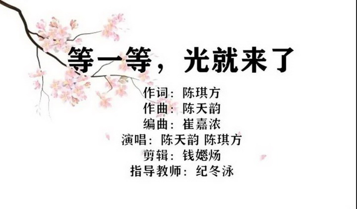 经过沟通与努力,陈琪方凭借其灵气和自身的感受,完成了歌词写作《等一等,光就来了!》。随后,音工系多位同学进行谱曲创作。一周后,创作小组从五首作品中挑选出大一陈天韵同学谱写的旋律,并立即安排大三崔嘉浓同学进行音乐制作。