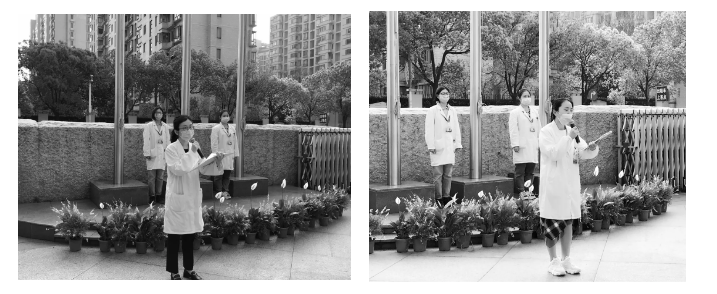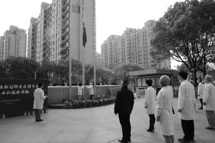 今天的门诊广场庄重肃穆,入口处竖起了“深切哀悼抗击新冠肺炎疫情斗争牺牲烈士和逝世同胞”的标语,升旗台前整齐地摆放着淡雅的鲜花。8时许,五星红旗在儿科医院门诊广场升起,短暂定格后缓缓下降至距离旗杆顶端1/3的位置。接着,全体人员为抗击新冠肺炎疫情斗争牺牲烈士和逝世同胞默哀。