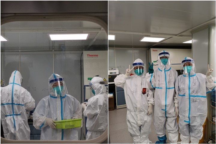 北京清华长庚医院提供的隔离区新建实验室的建立完全是从“零”基础开始,在医疗队到达时刚刚完成硬装。实验室约110平方米,其中PCR三区共计70平方米。从基本的水、电、气等硬件布局交付,信息系统端口的连接传输,以及各种不同型号类别的仪器调试、性能验证等系列工作,极大地考验医疗队各位队员的能力。复旦检验队和清华长庚检验科共同合作,长庚检验科同时协调相关部门在4天内完成了实验室家具、生物安全柜及冰箱的安装,网络布口与电脑联机。同时复旦医疗队完成6家单位携带物资(小型仪器、检测耗材及防护用品)的清点整理,核酸抽提仪、PCR扩增仪及小型仪器的安装与调试,并使用临床阴性标本、阳性质控和室间质评标本完成检测系统的性能评估,包括精密度、准确度、灵敏度、仪器间比对与人员比对。