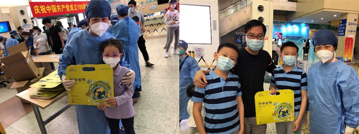 6月1日一早,儿科医院门诊恢复了往日的繁忙,门诊办公室的老师们早已等候在门诊大厅,亲手给来院就诊的孩子们送上专属的儿童节礼物,包括绘画本和儿童口罩。当小朋友拿到色彩斑斓的一册册绘本,觉得收到了最特别的六一节礼物,一位收到礼物的小朋友惊喜地说:“今天这不是来看病的啊,是来旅游的,还有礼物拿呢!”