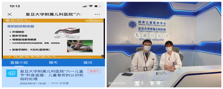 儿科医院互联网直播平台在疫情期间直播不间断,自5月31日至6月1日开展六一健康科普直播共7期,受众15800余人次,收到了家长们大量的好评。直播内容包括肾脏科尿床的困惑;新生儿外科的关注新生宝宝的红斑,“蛋蛋”肿了怎么办?风湿科的重视儿童关节痛;骨科的骨折认识和临时处理等。内容丰富,即使隔着云端,医生和患儿家长线上频频交流互动,增长儿童伤害预防知识、传播儿童健康促进理念,帮助孩子和家长在疫情期间提高自我健康管理的理念和能力。