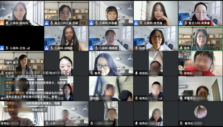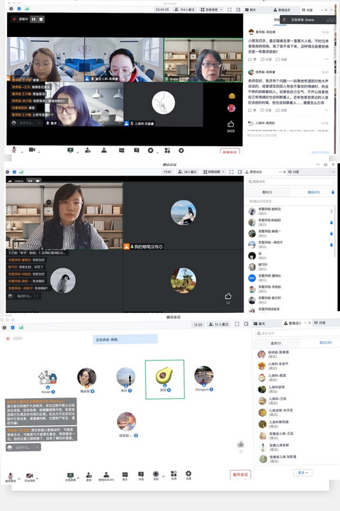线上的家长沙龙的总人数达到154家庭,绝大多数家庭都是在儿保科参加过家长培训课,因此很多问题也能非常有效的针对自己技能和儿童的薄弱点提出,并且在医生的指导和点拨下,获得更为具体有效的干预策略和方法。在公共讨论环节后,各位家长和嘉宾工作人员还进行了线上的大合影。
