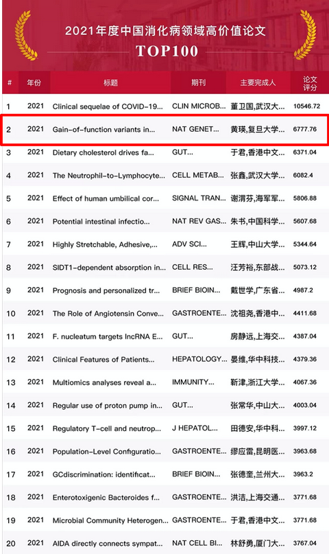 球学者库”发布了《2021年度中国消化病领域高价值论文TOP100》排行榜,由复旦大学附属儿科医院消化科黄瑛教授团队发表的论文登上该榜单,位列第二。