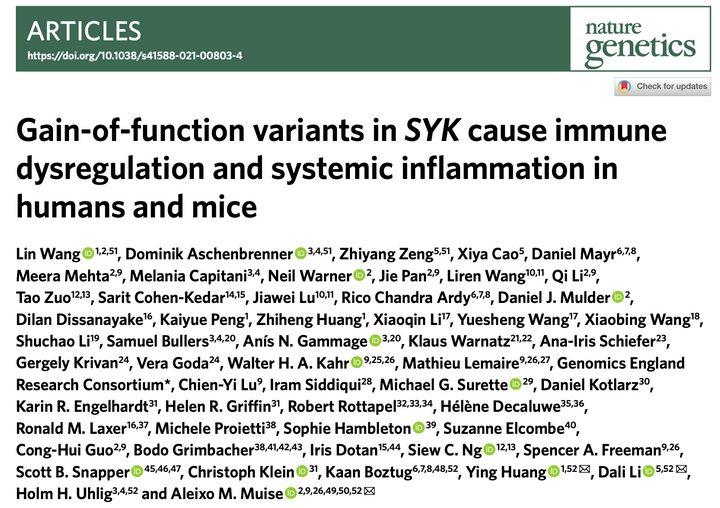 该研究论文“Gain-of-function variants in SYK cause immune dysregulation and systemic inflammation in humans and mice”于2021年4月发表于国际权威期刊Nature Genetics(影响因子38.33)。复旦大学附属儿科医院消化科王琳博士为第一作者,消化科黄瑛教授、华东师范大学李大力教授以及加拿大多伦多儿童医院(The Hospital for Sick Children)Aleixo M. Muise教授为该论文共同通讯作者。该项研究在国际上首次报道导致慢性肠炎、关节炎、皮肤炎症等多系统自身炎症免疫性疾病的一种新型致病基因SYK,开拓了极早发型炎症性肠病研究的新领域。同时还通过模拟病人突变成功构建了自发关节炎的小鼠模型,对动物模型进行多种干预验证了治疗该疾病的策略,为临床上治疗因SYK功能获得性突变引起的免疫失调相关疾病奠定了基础。