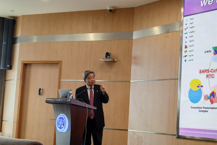 新冠肺炎疫情已经肆虐近两年,给全球带来了严重的生命和财产损失。国内外疫情仍在反复,同时据新华社报道,昨日中国内地首次发现新冠病毒奥密克戎变异株。为了应对这一场大灾难,全球科学家最紧迫的任务就是齐心协力来研究新冠病毒,以及开发治疗方法来对抗病毒。12月14日,饶子和院士做客“国家儿童医学中心前沿研究论坛”并带来首场讲座“Living in the cell: understand SARS-CoV-2 replication and transcription from structures”,从新冠病毒复制校正和mRNA加帽机制出发为我们解析SARS-CoV-2维持复制保真度的机制和病毒逃逸核苷类抗病毒药物的分子机制。此次讲座由复旦大学附属儿科医院儿科研究院、上海市出生缺陷防治重点实验室举办,上海医学院党委书记袁正宏、儿科医院院长黄国英、副院长周文浩以及临床医生、研究生及各科室研究人员共同参与。