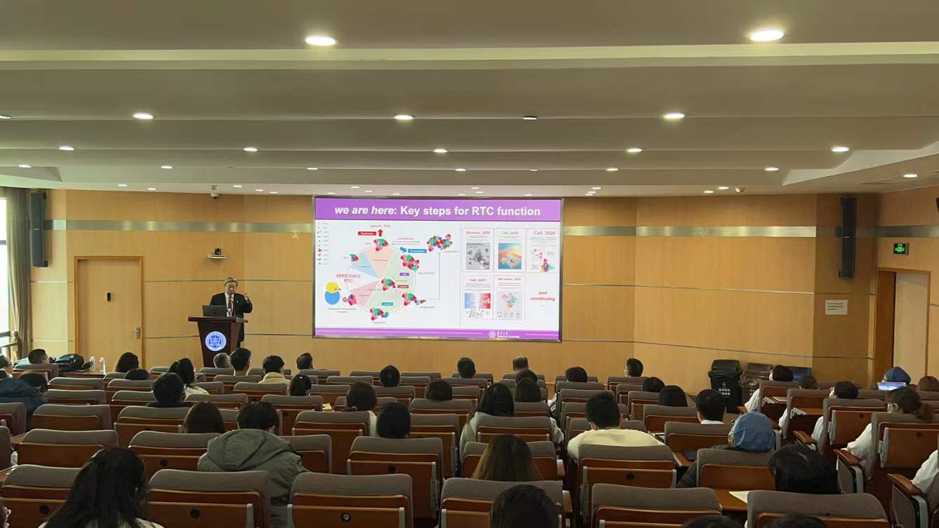 讲座中,饶教授介绍了自己团队新冠病毒的最新研究。他用动画视频及生动的讲述呈现了SARS-CoV-2一种关键复制转录复合体(RTC)的冷冻电镜结构。同时,他告诉我们该RTC是延伸复合体(EC)与共转录加帽复合体(CCC)耦合形成的Cap(0)-RTC,CCC的组成部分包括nsp12 NiRAN、nsp9、具有N端外切核酸酶(ExoN)和C端N7-甲基转移酶(N7-MT酶)的双功能nsp14,以及作为nsp14辅因子的nsp10。此外,他还阐明了SARS-CoV-2维持复制保真度的机制,让在场的观众认识到了病毒组装的时空复杂性,也感受到了科学世界的魅力。