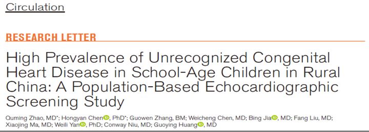 国际顶级心血管病学杂志Circulation(IF 29.69)于2021年12月6日在线刊登了复旦大学附属儿科医院心血管中心黄国英教授团队的研究论文“High Prevalence of Unrecognized Congenital Heart Disease in School-Age Children in Rural China: A Population-Based Echocardiographic Screening Study”。本研究通过严密的科学设计,开展了全球首个全人群的大规模超声心动图筛查和诊治工作,获得了我国欠发达地区学龄期儿童先心病的真实流行病学资料。