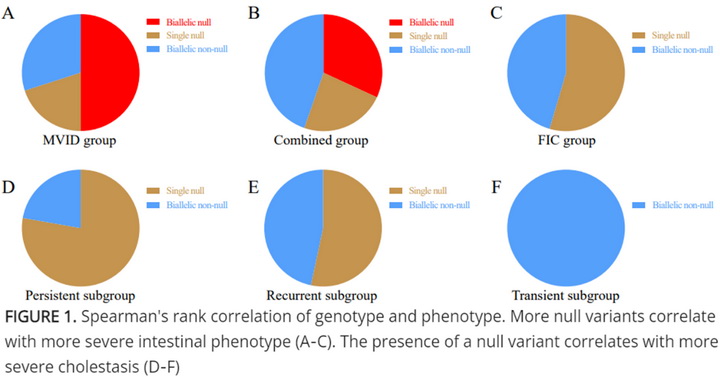 文献回顾共收集到118例MYO5B双等位基因变异患者,加上本研究的12例新患者,共130例患者纳入基因型-表型关系研究。作者将所有患者按照携带无功能变异的个数分为双等位无功能变异(Biallelic null)、单个无功能变异(Single null)及零个无功能变异(Biallelic non-null)三种基因型组;根据腹泻和胆汁淤积症状的表现情况分为三种临床表型组:一种是单纯MVID患者(MVID),患者以顽固性水泻为主要表现,无胆汁淤积相关记录;一种是单纯低GGT胆汁淤积患者(FIC),患者以持续性/复发性/暂时性低GGT胆汁淤积为主要表现,无明显胃肠道症状;一种是MVID患者伴胆汁淤积或FIC患者伴需短时静脉营养治疗的慢性/间断性腹泻的双表型(Combined);FIC患者内部进一步根据胆汁淤积特征分为持续性(Persistent)、良性复发性(Recurrent)以及暂时性胆汁淤积(Transient)三种临床表型亚组。研究结果进一步支持双等位无功能变异仅见于MVID,FIC患者至少携带一个预测保留Rab11a结合能力的突变。斯皮尔曼等级相关性分析发现MYO5B缺陷患者肠道症状严重程度与其携带的无功能变异个数呈正相关(ρ = 0.299, P = .001);FIC患者胆汁淤积严重程度同样与其是否携带无功能变异具有相关性,患者携带无功能变异倾向于表现为持续性胆汁淤积(ρ = 0.420, P = .029)。