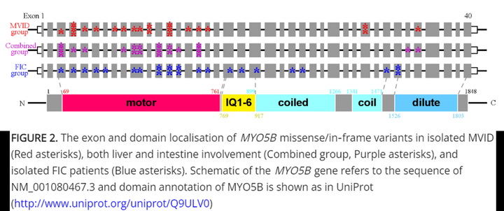 作者进一步将至少携带一个错义/非框移突变的患者纳入疾病表型与突变所在MYO5B蛋白结构域的关系研究。结果显示MVID组(25/25, 100%) 和Combined组(30/31, 97%) 患者携带定位于MYO5B蛋白Motor区的错义/非框移突变的比例明显高于FIC组(19/29, 66%, P = .001和 P = .002);相反,FIC组(16/29, 55%)患者携带定位于MYO5B蛋白非Motor区的错义/非框移突变的比例明显高于MVID组(3/25, 12%, P = .001)和Combined组(3/31, 10%, P = .000)。另外,携带错义/非框移变异位于MYO5B蛋白IQ区的患者仅表现为FIC (P = .000),其中错义变异c.2470C>T/p.Arg824Cys(预测影响IQ区功能)在8例患者中检测到,是FIC患者中最常见的突变位点。作者因此最终提出携带错义/非框移变异定位于MYO5B蛋白非Motor区,尤其是IQ区的患者更可能表现为单纯低GGT胆汁淤积,这对于预测患者临床表现以及指导MYO5B蛋白各结构域的功能研究有重要意义。