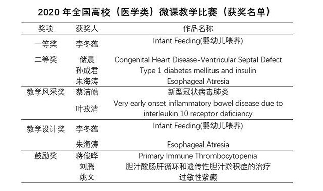 为持续贯彻落实《国务院关于加强教师队伍建设的意见》和中共中央、国务院印发的《中国教育现代化2035》的要求,我院作为国家儿童医学中心,一直以来持续推进教学改革与创新,全心全意为广大教师的职业能力建设服务。2020年,我院组织12名教师参加了 “全国高校(医学类)微课教学比赛”。通过激烈的角逐,2021年7月15日我院参赛教师的作品在87所高校的1150件作品中脱颖而出,荣获一等奖1项、二等奖3项、教学风采奖2项、教学设计奖2项、鼓励奖3项,优秀组织奖的优异成绩。