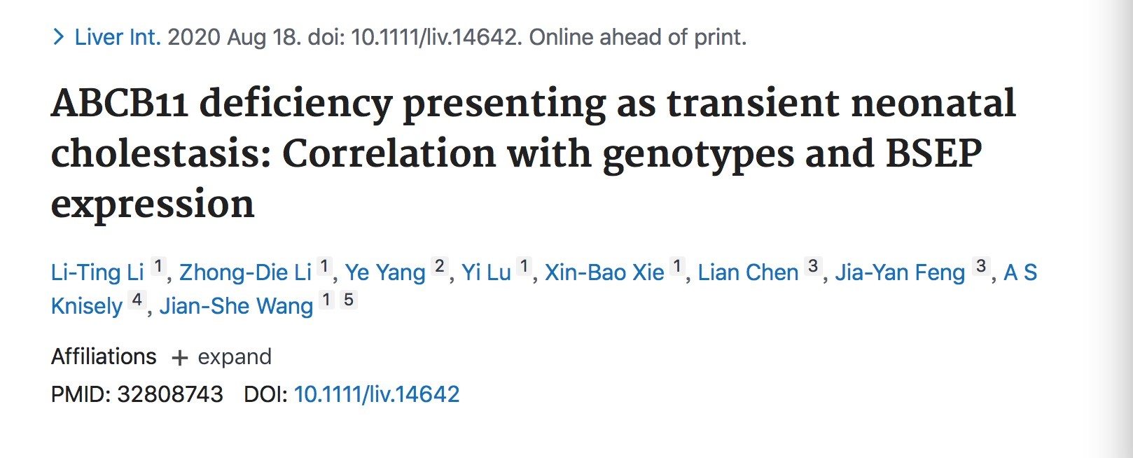 王建设教授从2003年开始进行ABCB11缺陷病的研究,在医院和国家自然科学基金面上项目的支持下,先后对24例临床上表现为低GGT婴儿进行性胆汁淤积症病例进行ABCB11基因测序,最终7例基因确诊ABCB11双等位基因突变,这一发现由刘丽艳硕士为第一作者于2010年发表于Liver International (Liu LY, Wang ZL, Wang XH, et al. ABCB11 gene mutations in Chinese children with progressive intrahepatic cholestasis and low glutamyltransferase. Liver Int. 2010,30(6):809-815)。这是课题组第一次在该期刊发表论文,也是国际上首次报告华人中该病的基因突变特征,因此该刊同期配发了对该文的评论。