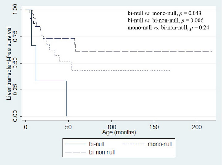 Fig. 1 Kaplan-Meier plot, liver transplant (LT)-free survival: Genetics (N bi-null = 3, N mono-null = 26, N bi-non-null = 39)