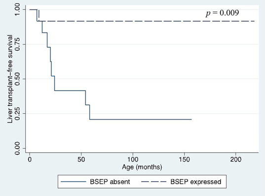 BSEP expression and survival without LT. 67% (8/12) of patients without BSEP expression and 8% (1/12) patients with BSEP expression underwent LT or died of liver failure.