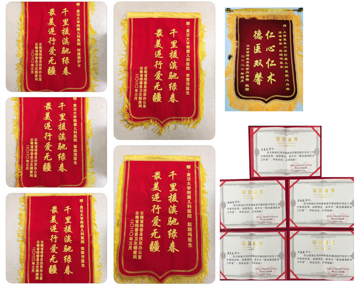 跨过短暂的冬日,绿春已是鲜花遍地、生机勃勃,第八批援滇医疗队到了返程的时间。基于医疗队的优良表现,云南省绿春县扶贫办公室、绿春县卫生健康局予以颁发锦旗“千里援滇驰绿春,最美逆行爱无疆”,并授予“最佳援滇医务工作者”称号。赵趣鸣医生另获得家长赠送锦旗一面。对于队员们来说,不管身在何方,绿春已成为他们心中最大的惦念,复旦大学附属儿科医院永远是绿春儿科医疗发展的强力后援及助力军。
