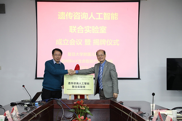 1月7日下午“遗传咨询人工智能联合实验室”在复旦大学附属儿科医院正式揭牌成立。中国科学院院士、著名遗传学家贺林教授、苏州Bio X生命智能产业研究院院长助理梁波博士、儿科医院黄国英院长、周文浩副院长、张晓波副院长及临床专科主任等出席了揭牌仪式。