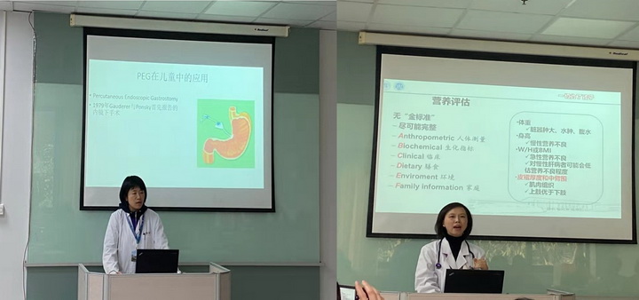 随后唐子斐医生以“经皮内镜下胃造瘘在儿童中的应用”为题目与小组成员进行了经验分享,对胃造瘘术的发展历程、置管方法、护理要点及鼻胃管与经皮内镜下胃造瘘术的区别等方面的专业知识进行了授课。钱甜副主任也介绍了儿科肠内营养管理的新进展,阐述了临床营养支持的重要性、营养风险筛查及评估的方法、肠内营养的治疗等。