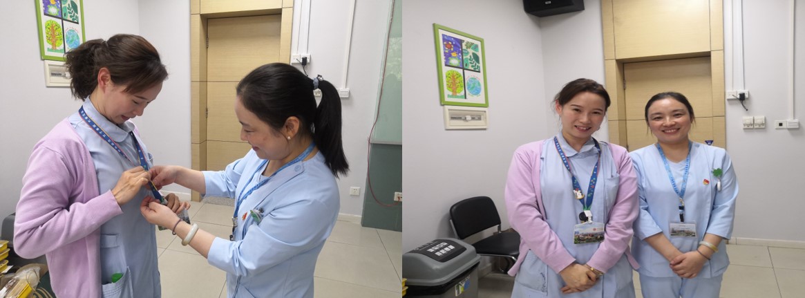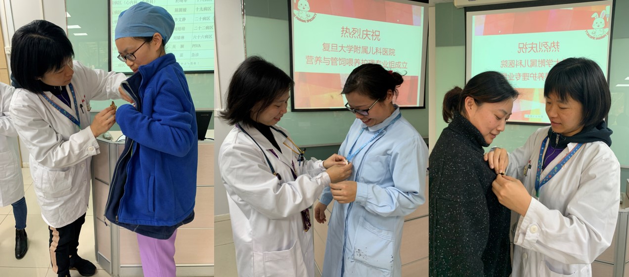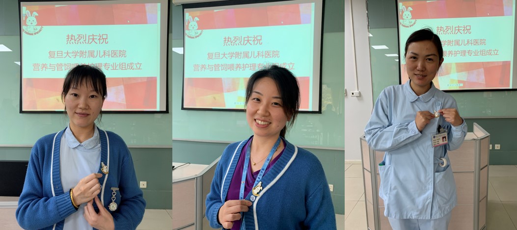 最后,专业组进行了授章仪式,为每一位成员佩戴专业组徽标。该徽标为一只正在连接重力营养管,经胃造口接受肠内营养治疗的“小兔子”,“Tube feeding specialty”字样以半圆形结构围绕着小兔子,象征着该专业组成员环绕怀抱着患儿,给予他们永远的支持和呵护。