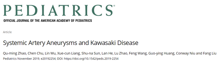Zhao QM, Chu C, Wu L, Liang XC, Sun SN, He L, Zhao L, Wang F, Huang GY, Niu C. Systemic Artery Aneurysms and Kawasaki Disease. Pediatrics.2019,144(6): e20192254.