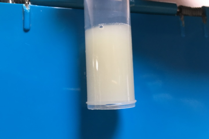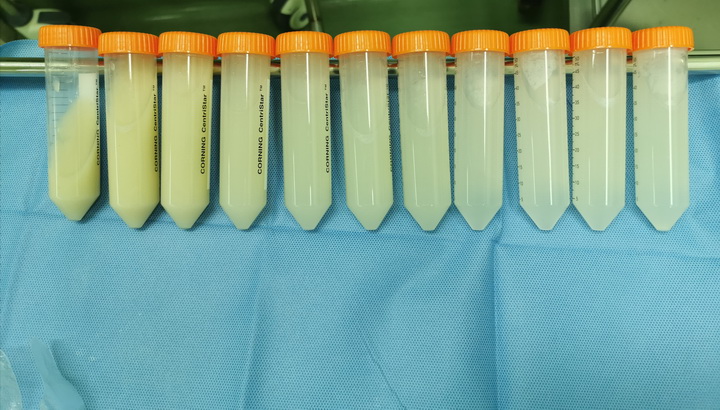 为了保证手术中的通气安全,整个团队通力合作,先用 2.8毫米的纤维支气管镜引导 3.5mm带套囊气管插管行右侧支气管插管,给予单肺机械通气。再用7F气管封堵器封堵左侧支气管。置管后患儿取右侧卧位,通过7F气管封堵器灌洗左肺。操作过程中每一位医生都心思缜密,操作精准,确保置管和通气顺利。灌洗时,首先将温热的生理盐水注入肺内,然后将液体在肺内保留片刻并给予充分震荡,浑浊的乳白色“牛奶”样液体被灌出,反复灌洗10余次,灌洗液共达550余毫升,回收500毫升,回收率高达90%。术中严密监测患儿生命体征和血气电解质,反复床旁B超检查肺部情况。术后复苏顺利,未吸氧下经皮氧100%,术后2天监护生命体征均平稳。首次全肺灌洗得到了相关科室如医务部和PIU的大力支持。