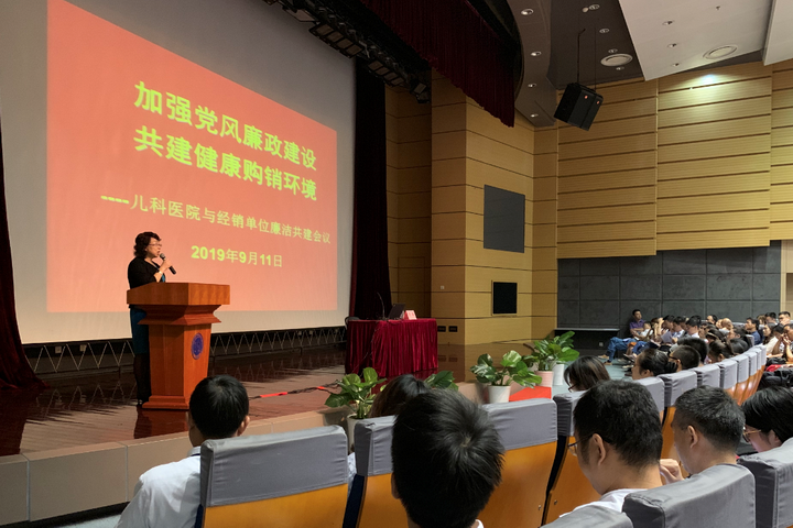 为进一步推进全面从严治党,加强党风廉政建设,强化行风建设力度,健全廉政风险防控机制,从源头上抵制医药购销领域商业贿赂,营造健康的购销环境,2019年9月11日下午,儿科医院召开了以“加强党风廉政建设,共建健康购销环境”为主题的供应厂商廉洁共建大会,这是继2006年开展治理医药购销领域商业贿赂专项活动以来召开的第14次会议。来自药剂、医用设备、试剂、耗材、办公用品(日用品)、基建、修缮、信息等526家供应厂商代表及医院各采购部门负责人和关键岗位工作人员参加了会议。会议由党委副书记兼纪委书记张瑾主持。