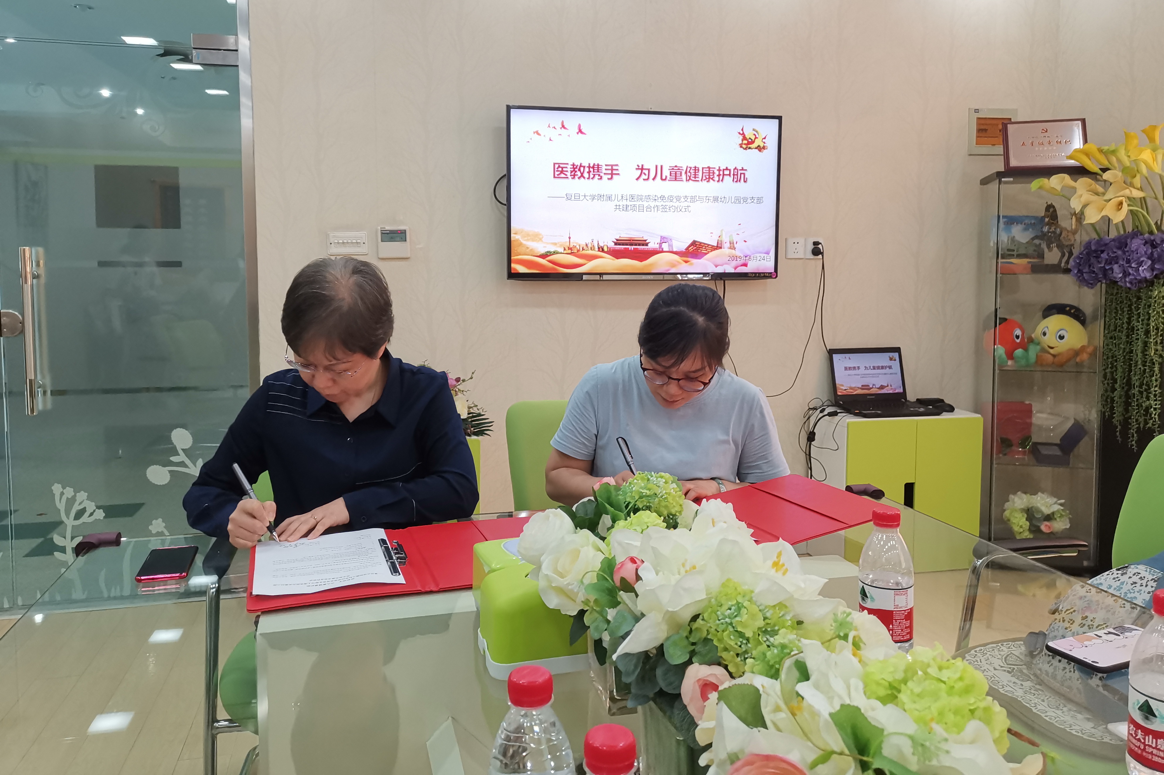 复旦大学附属儿科医院感染免疫党支部书记葛艳玲、支部副书记侯佳、东展幼儿园范怡园长、冯蓓莉副园长、大教研组长邬绮文老师以及党员教师代表出席仪式。活动特别邀请到儿童保健科主任徐秀教授、徐琼副主任、张凯峰副主任医生一起就儿童行为发育医教结合项目进行了深入探讨并达成了合作意向。