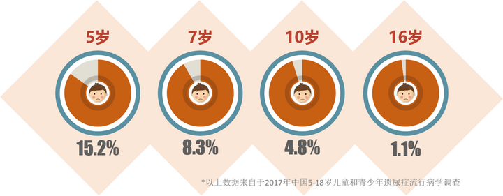 遗尿症是指大于等于5岁的儿童平均每周至少2次夜间不自主排尿,并持续3个月以上。如果孩子5岁以后仍频繁尿床。2017年中国5-18岁儿童和青少年遗尿症流行病学的调查表明,5岁的儿童中,其发病率为15.2%,而在16岁以上的儿童中,仍有1.1%的发病率。但是,令人担忧的是,遗尿患儿的就诊率很低。调查发现,我国10-14岁儿童尿床的就诊率为25%,15-18岁青少年尿床患儿就诊率仅为37%,明显低于欧美发达国家就诊水平。长期的遗尿症不仅会影响孩子的健康和生长发育,而且会影响孩子的智力发育和心理健康,及早的有效治疗可降低危害。