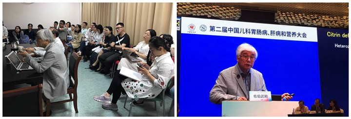 2019年6月19日-6月22日,日本鹿儿岛大学名誉教授、希特林缺陷病的发现者、国际知名专家佐伯武賴(Takeyori Saheki)来我院进行了为期三天的学习交流活动。这期间,在王建设教授的安排和陪同下,他主要和复旦大学附属儿科医院肝病科及复旦大学附属金山医院儿科的医生和研究生们就目前课题组在临床和科研过程中碰到的问题和今后的解决方案进入了深入探讨。20日,在儿科医院6号楼501教室,他做了题为《希特林缺陷病的历史及其小鼠模型的病理生理学》的报告。报告从两例病例入手,系统详细地讲解了成人期起病的Ⅱ型瓜氨酸血症CLDN2的发现、其致病基因SLC25A13的克隆及其在尿素循环中的功能研究;希特林缺陷症在新生儿期和成人期发病时的不同表现;希特林缺陷症在不同人群中发病率;希特林缺陷症小鼠模型的构建及临床治疗药物的研究进展;对希特林缺陷患者在临床治疗和日常饮食中应该注意的问题等。21日,应第二届中国儿科胃肠病、肝病和营养大会(嘉兴)的邀请,他又做了《LOLA(L-鸟氨酸/L-天冬氨酸)在治疗成人期起病的Ⅱ型瓜氨酸血症中的研究进展》的报告。