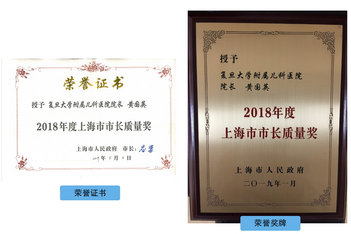 2019年5月6日上午,2018年度上海市市长质量奖颁奖仪式在上海市政府会议室隆重举行。上海市市委副书记、市长应勇、上海市副市长许昆林等领导出席颁奖仪式。应勇市长亲自为获奖组织和个人颁奖并发表重要讲话。复旦大学附属儿科医院黄国英院长荣获上海市市长质量奖。