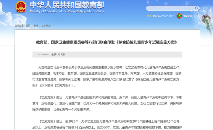 在今年8月初,教育部、国家卫生健康委员会根据党中央、国务院部署共同起草了《综合防控儿童青少年近视实施方案(征求意见稿)》,文中提到:至2030年,实现6岁儿童近视率控制在3%左右,小学生近视率下降到38%以下,初中生近视率下降到60%以下,高中生近视率下降到70%以下,并纳入各省市政府工作考核。