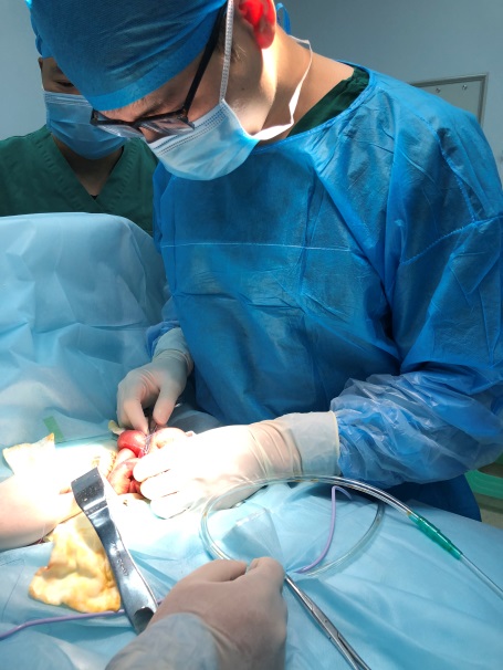 在此之前,彝良县人民医院从未做过新生儿手术,缺少相应的儿童专用器械和监护条件,麻醉科也缺少新生儿麻醉经验。而且良良体重只有2530克,腹胀严重,伴有呼吸急促,难以耐受长时间手术。如何能克服各种硬件条件的不足,在保证手术安全的情况下尽量缩短手术时间,是摆在大家面前的难题。复旦大学附属儿科医院援滇医疗队迎难而上,5名队员团结奋进,为手术顺利开展保驾护航。经过几个小时紧张忙碌的准备,手术凌晨1:00开始,术中的探查结果证实了术前的判断,孙松医生按照预定的方案对良良进行了肠造瘘术。