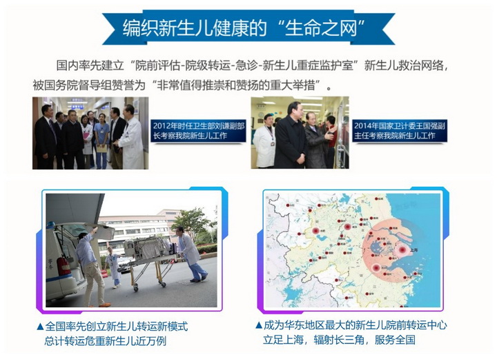 我院自2002年率先创立新生儿转运新模式,为危重新生儿编织健康生命网。作为代表中国新生儿危重病救治和转运最高能力的标杆中心,16年来共计转运危重新生儿病人近万余例,承担上海9个区的常规转运工作,并辐射华东地区乃至全国,在生命起跑线上为新生儿健康保驾护航,实现新生儿转运途中零死亡,并创下多项中国第一,如转运我国体重最轻双胞胎早产儿、航空超远程转运距离7000公里的新疆维吾尔族病人等。“生命之网”的高效性、有效性和创新性,被国务院督导组赞誉为“非常值得推崇和赞扬的重大举措”。