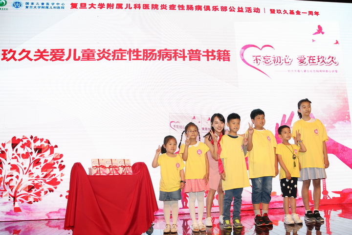 消化科主任黄瑛教授对“玖久专项基金”成立一周年进行了简单的工作汇报及计划,从中展示了我科在炎症性肠病诊断研究与治疗进展中的所取得的优秀成果,进一步体现了“玖久专项基金”“玖久”救助,“肠”久呵护”的美好寓意。陆敏先生作为捐赠方代表也饱含热情地对一年来的工作表示肯定与支持,并强调患儿的健康需要大家共同的努力和奋斗。著名影视演员张嘉倪女士也不辞辛苦来到了现场,参与了《儿童炎症性肠病科普小讲堂》新书赠书仪式。患儿及家长代表也登台分享了自己的求医之路,虽然他们陈词朴素,但他们的发言时而令人心酸流泪,时而令人欢欣鼓舞,他们的就医经历也让那些新发病患儿的家长看到了战胜疾病、恢复健康的希望。