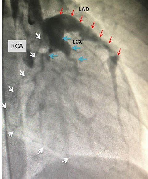 冠脉造影图。右冠(RCA,白色箭头)已完全闭塞,仅显示细小侧枝供应远端;左前降支(LAD,红色箭头)巨大瘤样扩张、血栓形成伴远端不规则狭窄;左回旋支(LCX,蓝色箭头):近端巨大瘤样扩张。