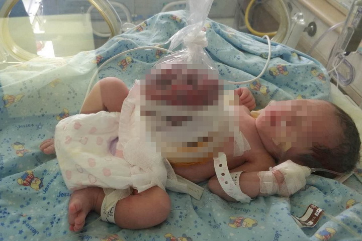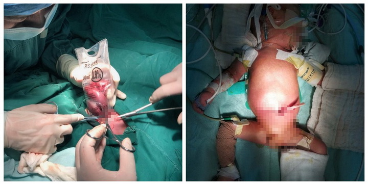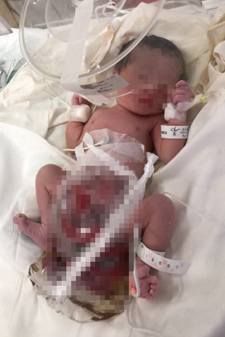 2018年3月16日11点33分,一个小生命在复旦大学附属妇产科医院产房里诞生了。其母亲在怀孕30周左右进行例行产前B超检查时发现胎儿存在腹裂严重畸形。当确定宝宝家属要求继续妊娠的情况下,通过复旦大学附属儿科医院(国家儿童医学中心)出生缺陷临床中心与复旦大学附属妇产科医院搭建的胎儿结构畸形围产期管理与诊治平台,立即对孕妇及胎儿进行个体化的围产期监护诊治,孕期对胎儿实施包括产前B超、胎儿核磁共振,基因染色体筛查等一系列精准检测与母体个体化护理及分娩方案。并在生后第一时间由专业转运团队通过平台绿色通道将患儿转诊至复旦大学附属儿科医院新生儿重症监护室(NICU)进一步诊治,通过细致的体格检查确定患儿为一例严重的腹裂病例,腹腔内的胃,小肠及结肠通过缺损的腹壁全部脱出体外,加上患儿为35周早产儿,出生体重仅为2080g,随时可能由于严重的低容量性休克或重症感染导致死亡。