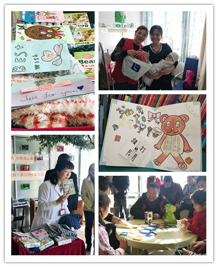 在儿科医院社工部的组织下,一群“红马夹”们为冬日的儿科医院病房带来了融融的暖意。闵行区台办和闵工委的领导与闵行区台商志愿者们来到儿科医院将500份包含闵行区台商祝福的新年礼包送到住院患儿的手中,礼包里不但有一件崭新的羽绒背心、一条温暖的魔术围巾、一盒手工饼干以及一张别致的手绘贺卡。有张贺卡片上写到:“我马上就要回台湾过年了,希望不能回家的小朋友快点好起来,祝大家春节快乐!”这是由500名台商子女在学校放假前完成的新年手绘贺卡。