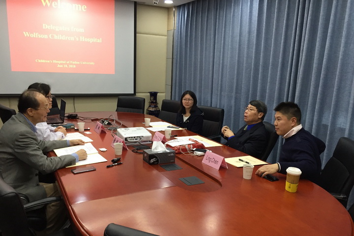 黄国英院长对Dr. Chiu教授一行的到来表示欢迎并介绍儿科医院基本情况。Dr. Chiu教授介绍了沃尔森儿童医院所在的城市——杰克逊维尔的风土人情,沃尔森儿童医院、佛罗里达大学和内穆尔儿童健康中心(Nemours Children’s Health System)三者间的合作互补关系。本次来访是继2017年7月Michael D. Aubin院长来访后两家儿童医院的再次深入会晤,旨在洽谈两院之间开展医院管理、科学研究等方面的合作事宜。Dr. Chiu教授代表沃尔森儿童医院院长Michael D. Aubin呈递邀请函,诚邀黄国英院长今年适当的时候访问沃尔森儿童医院。