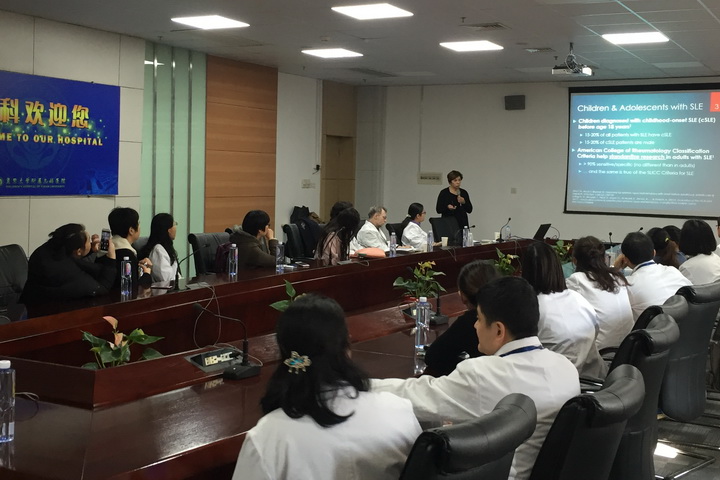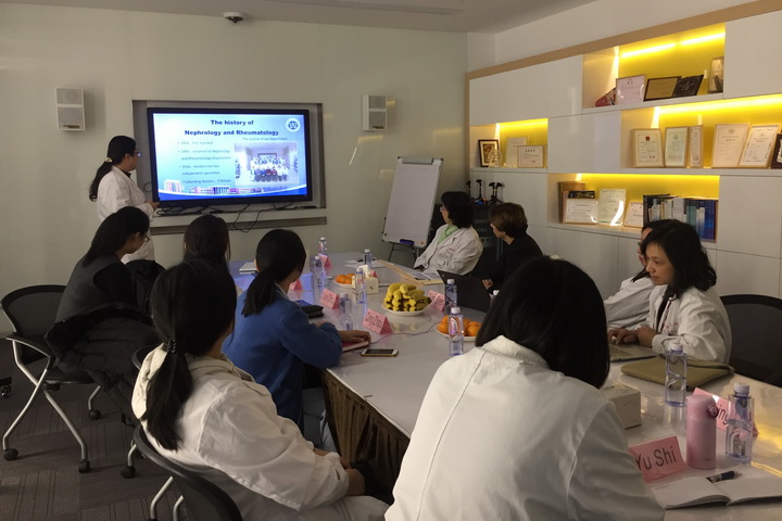 Brunner教授长期从事儿科风湿病的临床科研工作,对于幼年型特发性关节炎、系统性红斑狼疮等风湿病有着丰富的临床经验,尤其对于儿童系统性红斑狼疮的诊治有独到的见解。第一天下午受限举行了个小型的讨论会,与会的有风湿团队,肾脏团队,和护理团队的骨干。首先风湿科孙利主任介绍了科室的概况,主要从科室的发展历史、疾病谱的演变、治疗的新突破,以及新的科研成果等方面向外宾进行了展示。Brunner教授对我科已经取得的成绩予以肯定。然后进入了自由讨论环节,整个会场高潮迭起,从多维度和多角度进行了热烈地讨论,内容涉及狼疮性肾炎的肾活检指针,生物制剂(CD20单克隆抗体)在难治性系统性红斑狼疮中的使用经验分享,霉酚酸的药代动力学浓度监测指导临床霉酚酸酯的剂量调整,狼疮性肾炎的生物标志物研究,强调了物理治疗PT(physical therapy)在儿童慢性关节炎康复中的地位,专科护士在慢病管理中的作用,护士指导患者生物制剂居家注射,以及美国慢病管理模式的分享(SLE患者,儿童至成人期转介的流程及经验)等等。