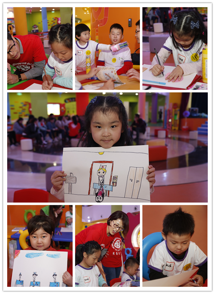绘画环节,华鑫置业(集团)有限公司的红鑫公社的志愿者哥哥姐姐们陪小朋友们来到绘画区,用彩色的画笔画出内心的金色童年。《打针我不怕》、《护士阿姨来查房》、《列车外的景色》等等,勾画了色彩明丽的房子、阳光满满的窗、温柔美丽的护士阿姨、高空中的飞机……当得知这些画如果画得好,可以参加义卖活动,帮助更多生病的小朋友,孩子们画得更起劲了;知恩,感恩,回馈社会的种子,悄悄地扎根在孩子们的心中。