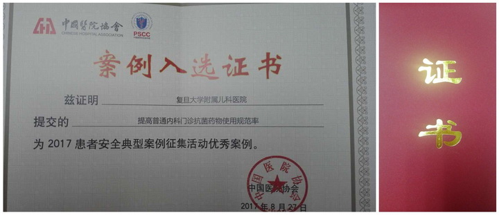 中国医院协会发布了2017年患者安全优秀典型案例获奖名单。由复旦大学附属儿科医院门急诊管理办公室以“对应患者安全目标,确保用药安全”为主旨,《提高普通内科门诊抗菌药物使用规范率》荣获本届优秀案例。此项目由门急诊管理办公室主任沈国妹和原质量管理办公室主任王素娟主任联合协作,并与医院医务科、药剂科、院感科、信息科、感染科共同完成此项目,在此也表示感谢!