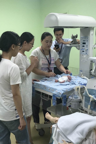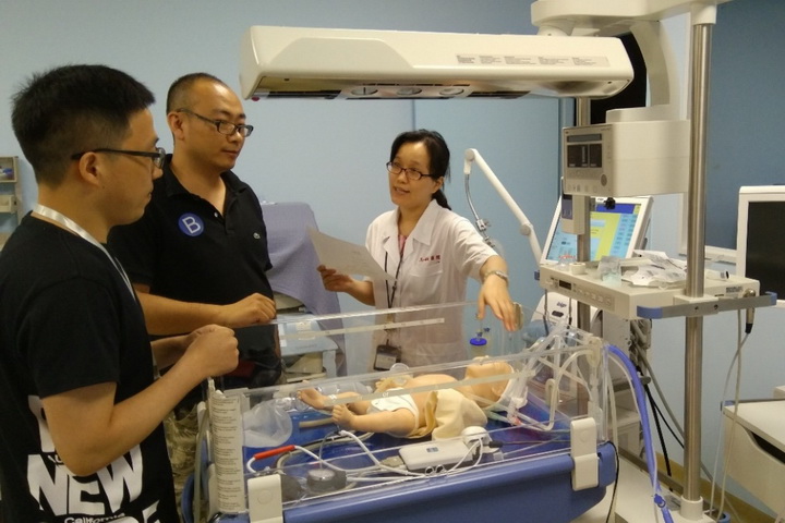 此外,学习班开展了模拟新生儿病例实训。模拟病例来自于我院新生儿科多年来收集的经典案例,包括RDS、PPHN、BPD、肺出血等病例。在工程师技术支持下,使用模拟新生儿再现案例,每2-3位学员进入实训室对模拟患儿进行查体和分析,根据模拟病情调整治疗方案,并由我院新生儿科专家进行点评、分析和指导。这是本学习班的首次尝试,学员们通过模拟实训,将理论结合实际,有助于他们未来实际临床工作中对患儿更好地判断病情和开展救治。