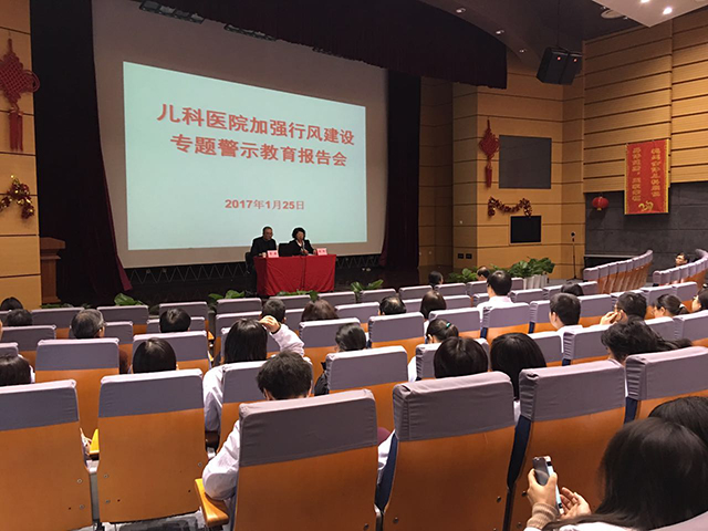 为进一步加强医德医风和行业自律,保持医院良好的廉洁文化氛围,2017年1月25日,儿科医院纪委召开了加强行风建设专题警示教育报告会,邀请徐汇区人民检察院反贪局常务副局长李骏来院作专题警示教育报告,我院院领导、中层干部、护士长、党支部书记、关键岗位工作人员及临床与职能部门工作人员共计184人出席了警示教育活动。会议由徐虹书记主持。
