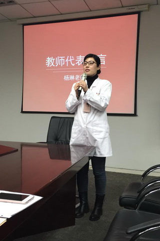 自我介绍过后郑院长对大家的到来表示欢迎,郑院长以自身经验告诉大家“儿科医生每天见到的是孩子们纯洁善良的眼睛,这些孩子令医生也保持一颗善良青春的心,大家有了一个好的开始,那就应该为自己的初心写一个句号”。杨琳老师作为教师代表,同时也作为医院的医生和辅导员代表,她告诉同学有任何困难都可以找老师询问和协商,老师也会主动与大家一起交流沟通,表达了对学生生活和学习的关心,在最后,杨老师更是表达了以后可以与同学成为同事的期待。