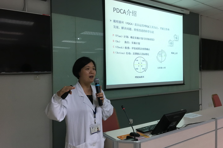 为了更好的推进和协助科级质量改进项目落实,管考办于2016年10月26日下午,在多功能厅召开了2016年质量改进项目督查说明会,并就如何科学规范的做好项目呈现进行了专题培训。本次会议邀请了曹莲华和贾宏丽两位督导专家及所有质量改进项目的负责人/执行人。58个项目中40个项目负责人/执行人参加了本次会议,累计43人参会。会议第一部分为“2016年质量改进项目督查说明会”,由管考办张海莹向大家介绍11月即将开展的质量改进项目督查工作,对督查形式、督查内容、督查要领作了具体说明及重点提示,以帮助各部门更好迎接督查;第二部分为题为“质量改进项目的推进和呈现”的专题培训,王素娟主任以PDCA改进为例,对项目的呈现及推进过程中各环节所需运用的QC工具都进行了全面辅导和培训,培训中展示了各种操作案例。