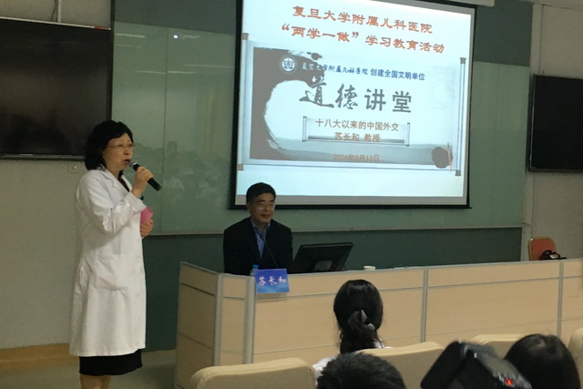 徐虹书记总结提出,医院邀请苏长和教授作为本次“儿科道德讲堂”的讲者,他来自于医院党委共建单位——复旦大学国际关系与公共事务学院,苏教授的讲课让儿科医务工作者更加深刻地理解习近平总书记的系列讲话精神,同时加深了共建单位间的沟通交流,也促进今后更多的资源共享、合作共进的党建交流。医院党委将严格按照中央部署,扎实推进“两学一做”学习教育的开展,“两学一做”基础在学,关键在做。全体党员立足本职岗位,发挥党员先锋模范作用,引领全体儿科人,在推进医院“创建全国文明单位”过程中,在医院“十三五”建设过程中,以“尊重、平等、热情、关爱”的服务理念,切实提高医疗服务水平,努力改善患儿就医体验,建立中外儿科学术交流重要桥梁,为创建亚洲一流的儿童医学中心而奋斗。