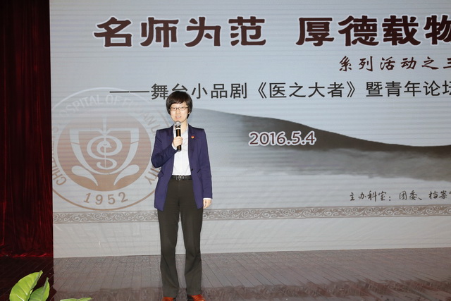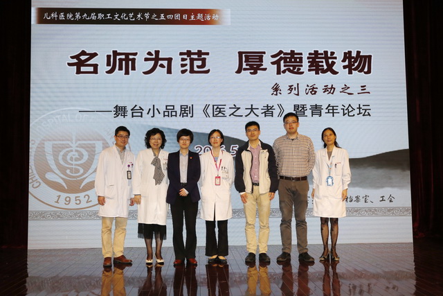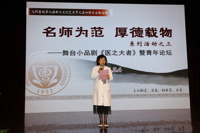 我院结合《名医大家》、《复旦名师剪影》、《儿科名医访谈录》三本读物,以“名师为范、厚德载物”进行主题活动,本次活动已经是第三期。《医者之大》舞台小品剧不仅采取多角度改编和整合,而且借助多媒体等新颖的艺术表现手法,丰富舞台效果,通过情景表演,诠释名医大家的风采和精神。